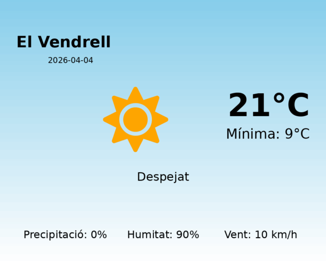 Avui, El Vendrell es presenta amb unes condicions meteorològiques força agradables i tranquil·les. Amb una temperatura màxima prevista de 21 graus i una mínima de 9 graus, el dia serà ideal per gaudir a l’aire lliure sense les inclemències del temps.